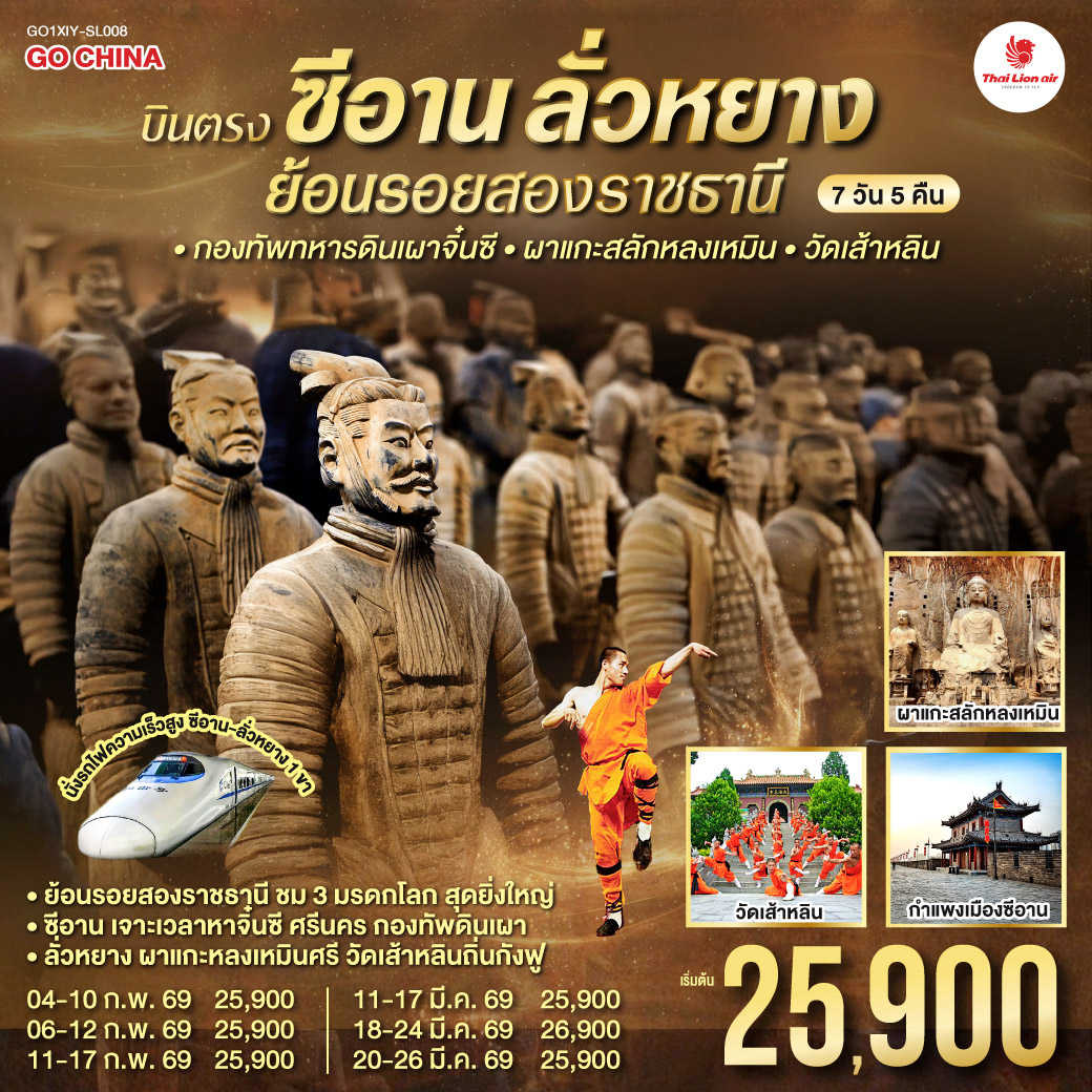 | 1 | กรุงเทพฯ (ดอนเมือง) – ซีอาน (ท่าอากาศยานซีอานเสียนหยาง) (SL950 : 20:00 - 00:35+1) | ✘ | ✘ | ✘ | HOLIDAY INN EXPRESS XI’AN HOTEL หรือเทียบเท่าระดับ 4 ดาว (มาตรฐานประเทศจีน) |