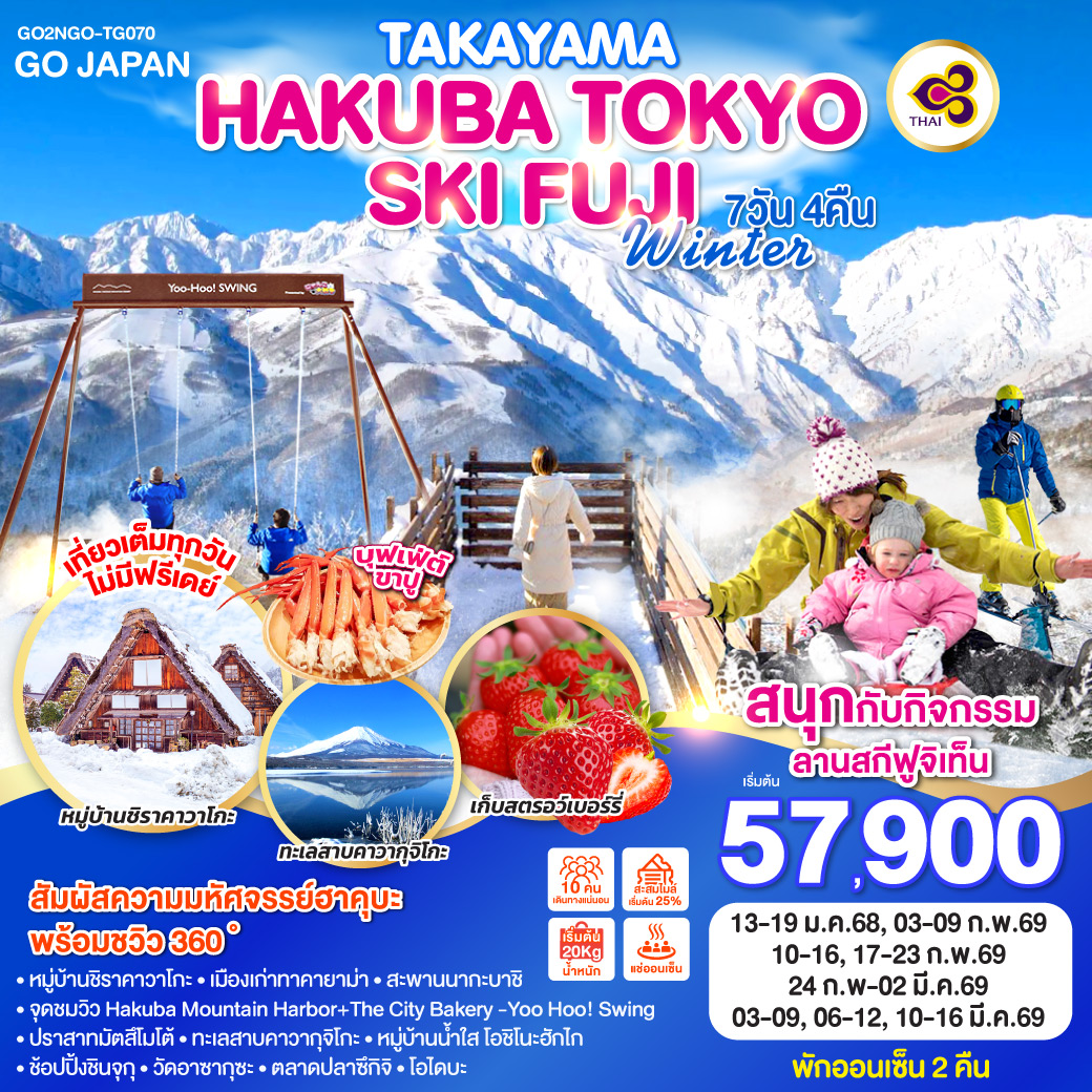| 2 | นาโกย่า (สนามบินชูบุเซ็นแทร์) - หมู่บ้านชิราคาวาโกะ - เมืองทาคายาม่า – เมืองเก่าทาคายาม่า – สะพานนากะบาชิ - ผ่านชมทาคายาม่า จินยะ - แช่น้ำแร่ธรรมชาติ | ✘ | ✔ | ✔ | TAKAYAMA ONSEN HOTELหรือเทียบเท่าระดับ 3 ดาว ♨️ |